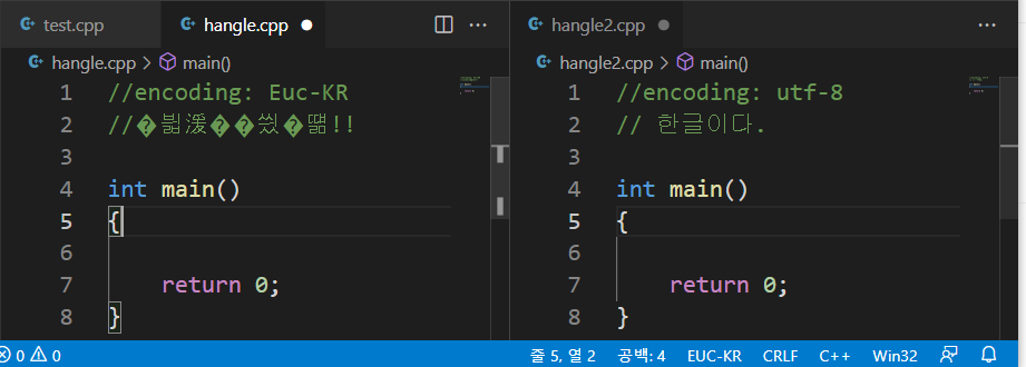 VS에서 컴파일할때 사용하는 인코딩 방식(UTF-8)과 우리가 처리하는 인코딩 방식,